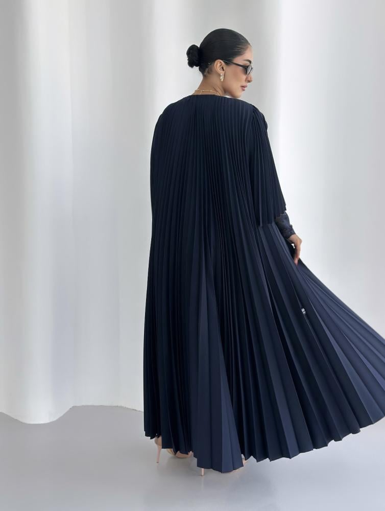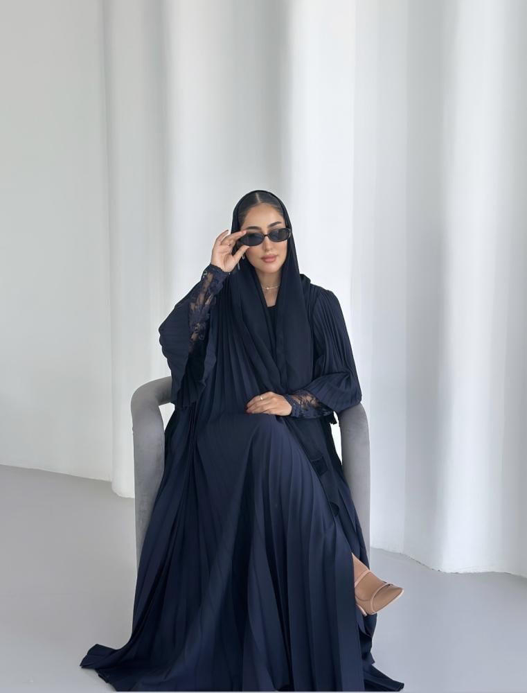 عباية من الكريب المكسر مزينة بالدانتيل بالأمام ، مع أكمام دانتيل بالكامل.